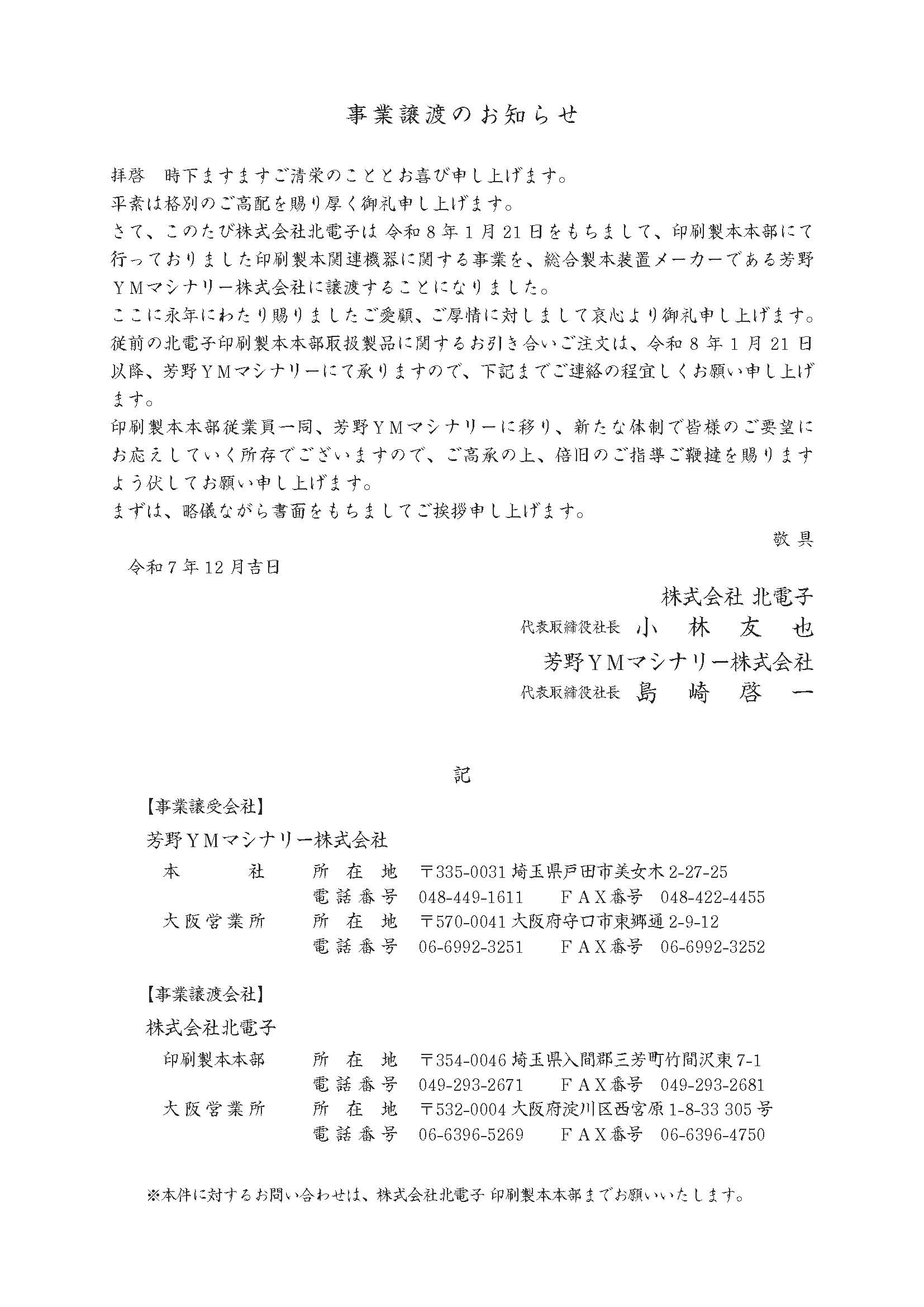 さて、このたび株式会社北電子は 令和8 年1 月21 日をもちまして、印刷製本本部にて